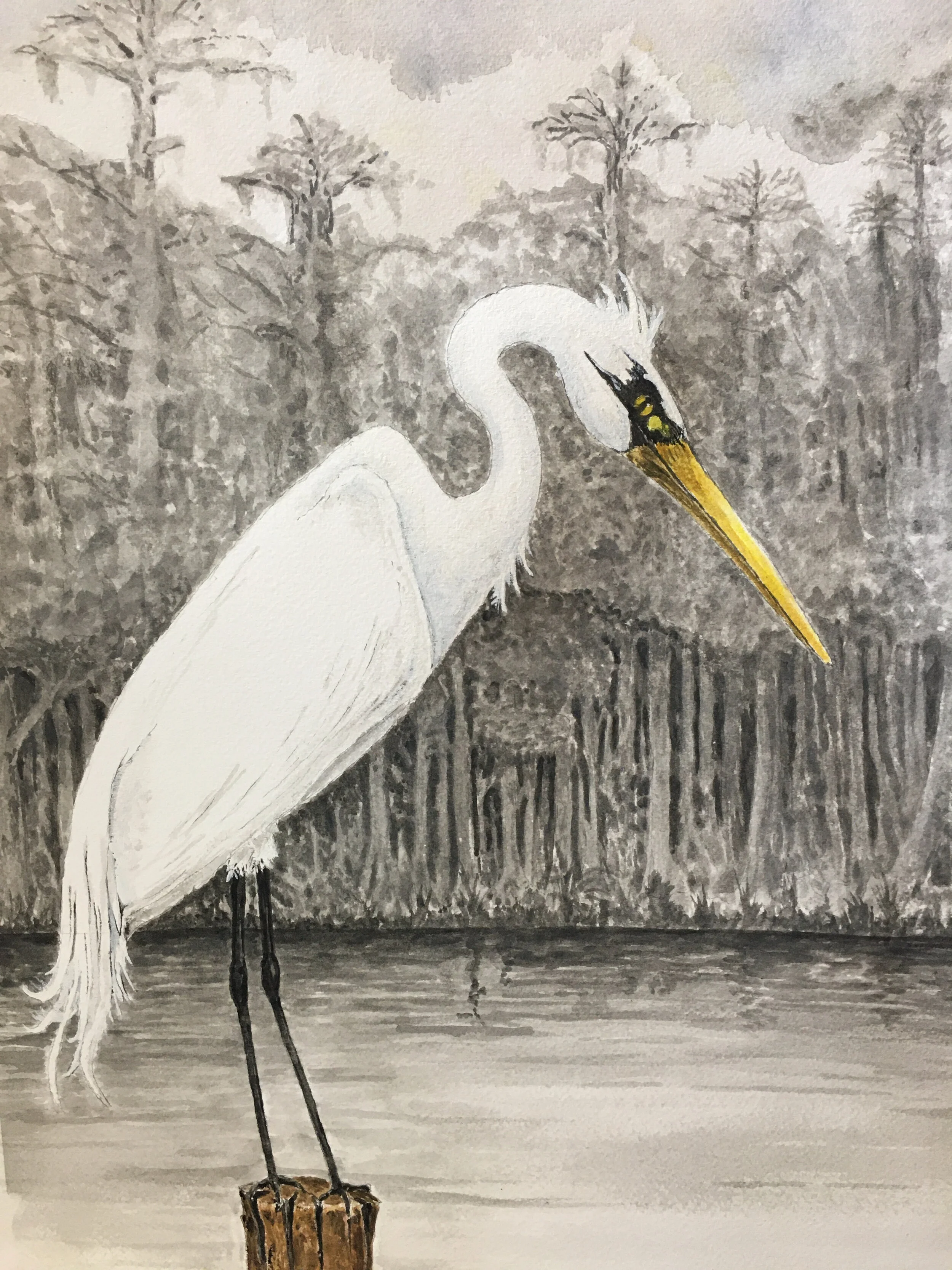 "Great Egret". Awarded 3rd Place in The Louisiana Watercolor Society Summer Show. Painted on 140# Arches Hot Press cotton paper 22"x30". $1,900.00/SOLD Museum Framed Limited numbered and signed prints available, 1 - 50; $200 (Printed on Arches Cold Press cotton paper 22"x30"). Smaller prints 14"x20" prints $120