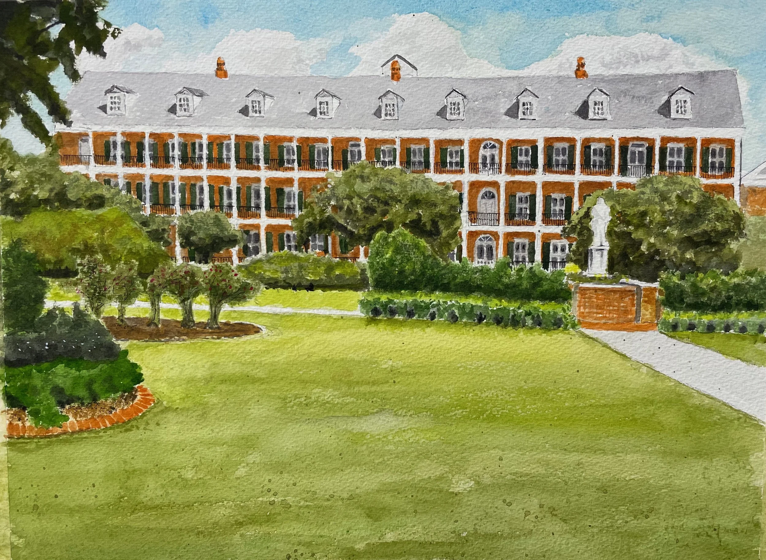 "Oak Alley - Sacred Heart Academy" Original painted on 300# Arches cotton, 12"x15". $475/SOLD. Prints 1-50 $100, on 140# cotton