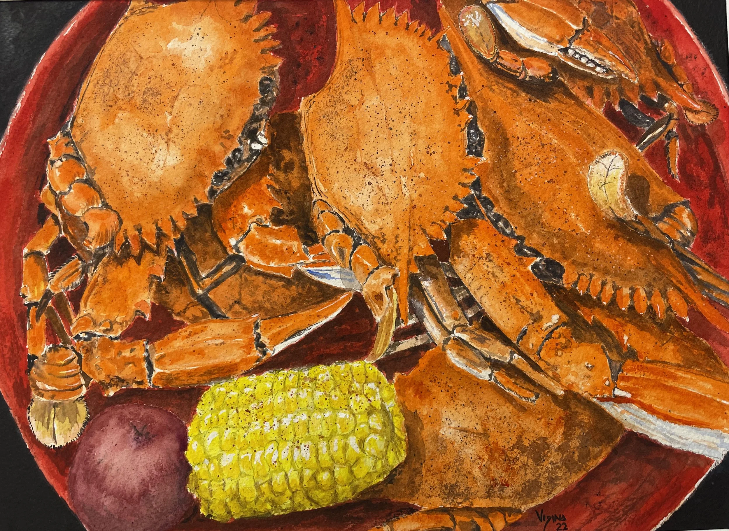 "Boiling Point - Crabs", 16"X12" . Painted on 300# Arches Cold Press cotton. Original $650, Limited numbered, signed prints on "140# Arches Watercolor cotton, available, 1 - 100; (16"x12"); $110