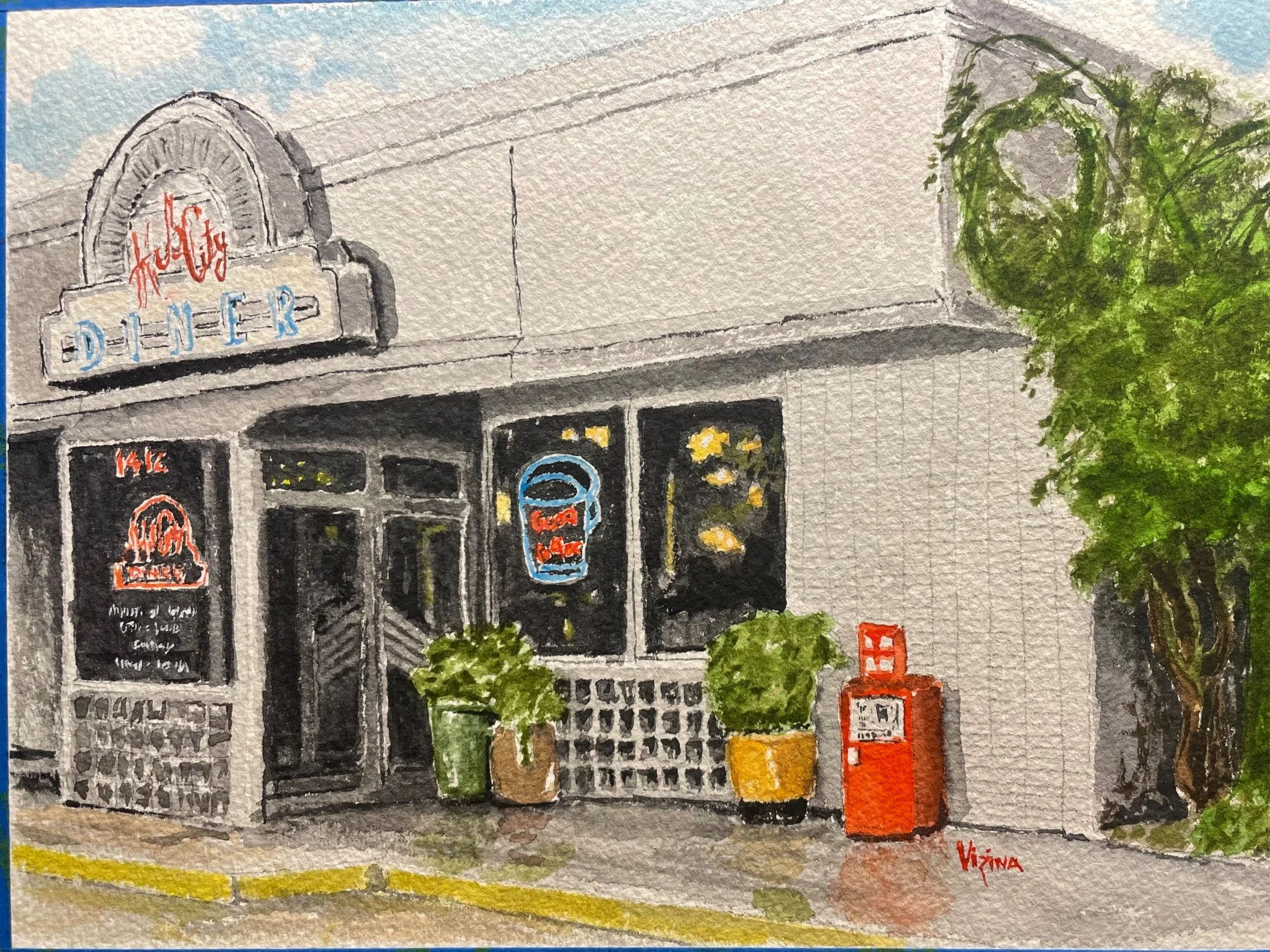 "Hub City - Diner Lafayette" Original painted on 140# Arches cotton, 12"x8". SOLD/$175; Prints 1-50, $95, on 140# cotton