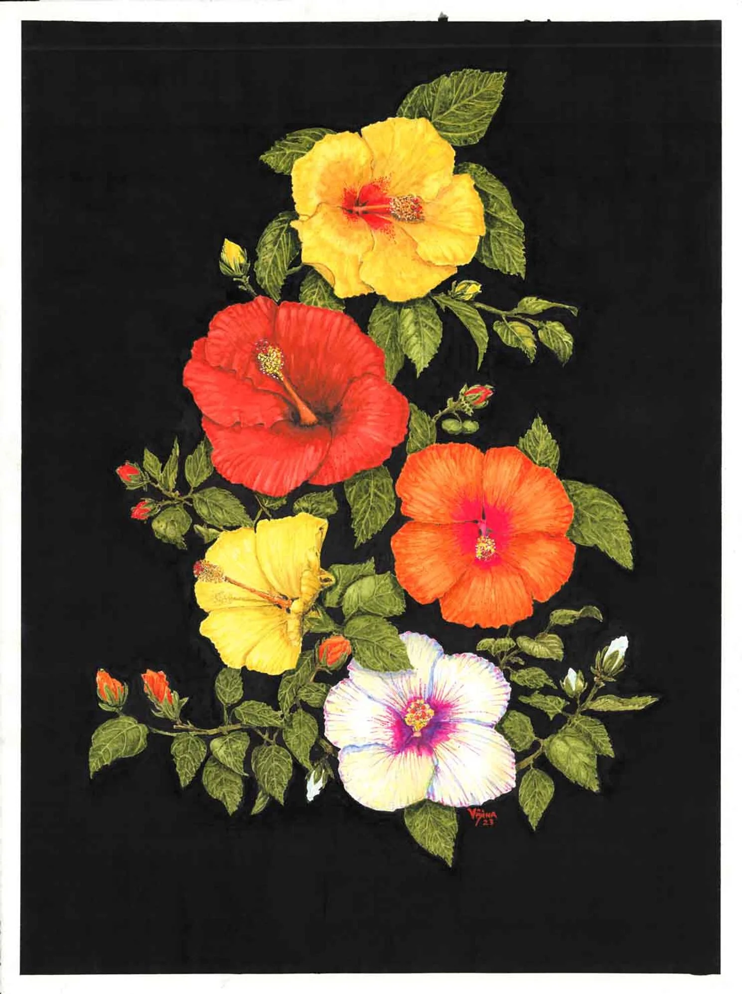 "Hibiscus Tea Party", 22"x30" on Arches 300#, 100% cotton paper.. Original $1,100. Giclee Limited prints, 1 - 50, available. 22"X30" $150, 12X16 $120
