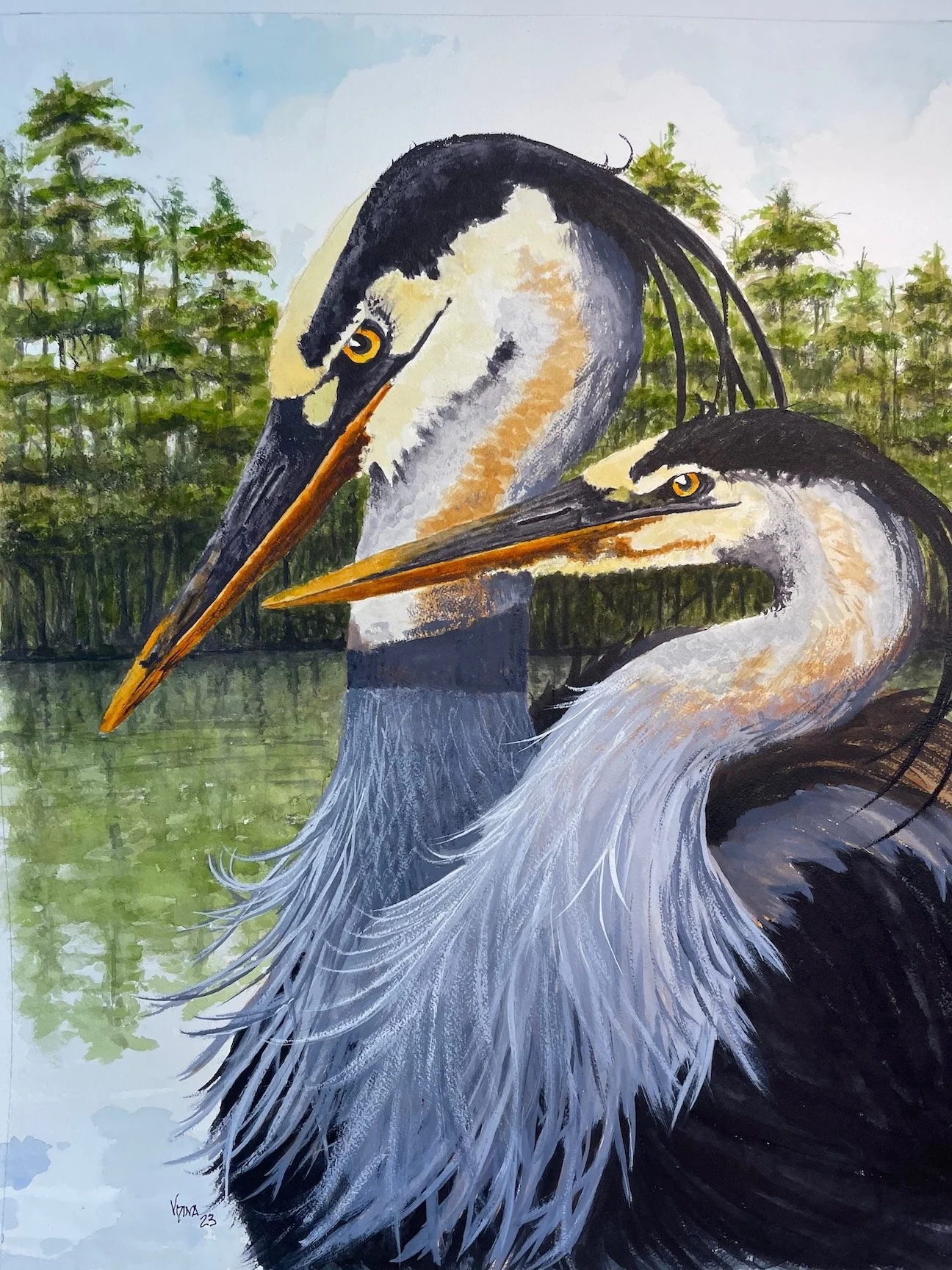 "Great Blue Herons", 18"x24" on Arches 300#, 100% cotton paper.. Original $1,100/Sold. Giclee Limited prints, 1 - 100, available. 18"X24" $150, 12X16 $120