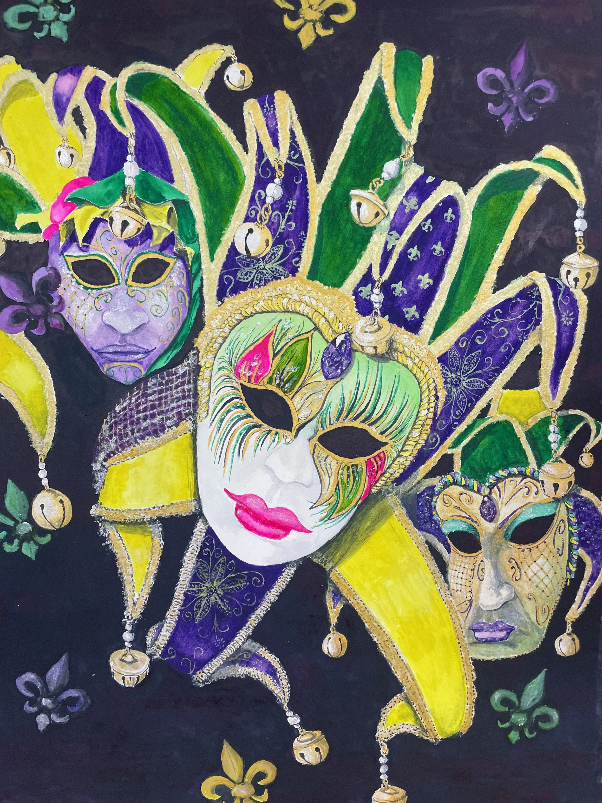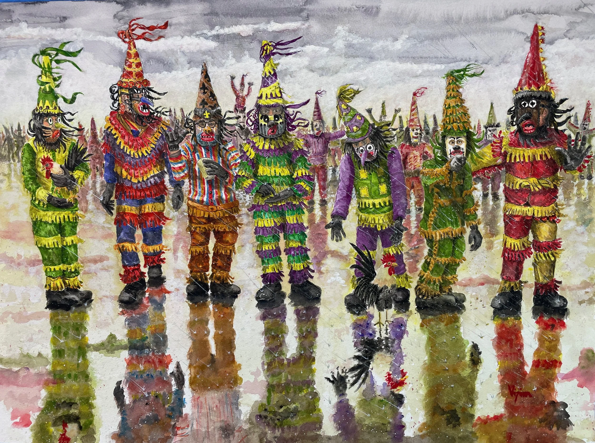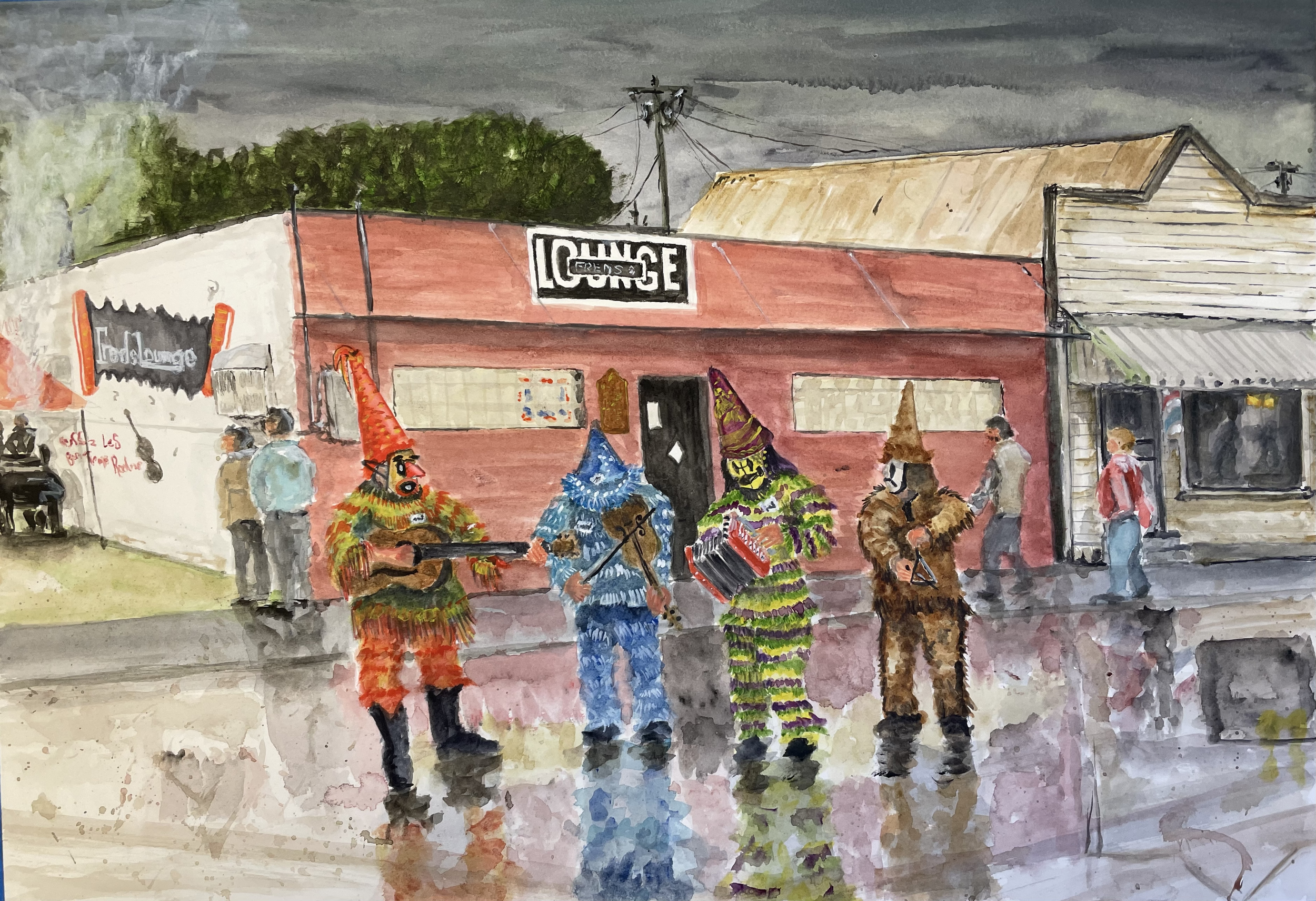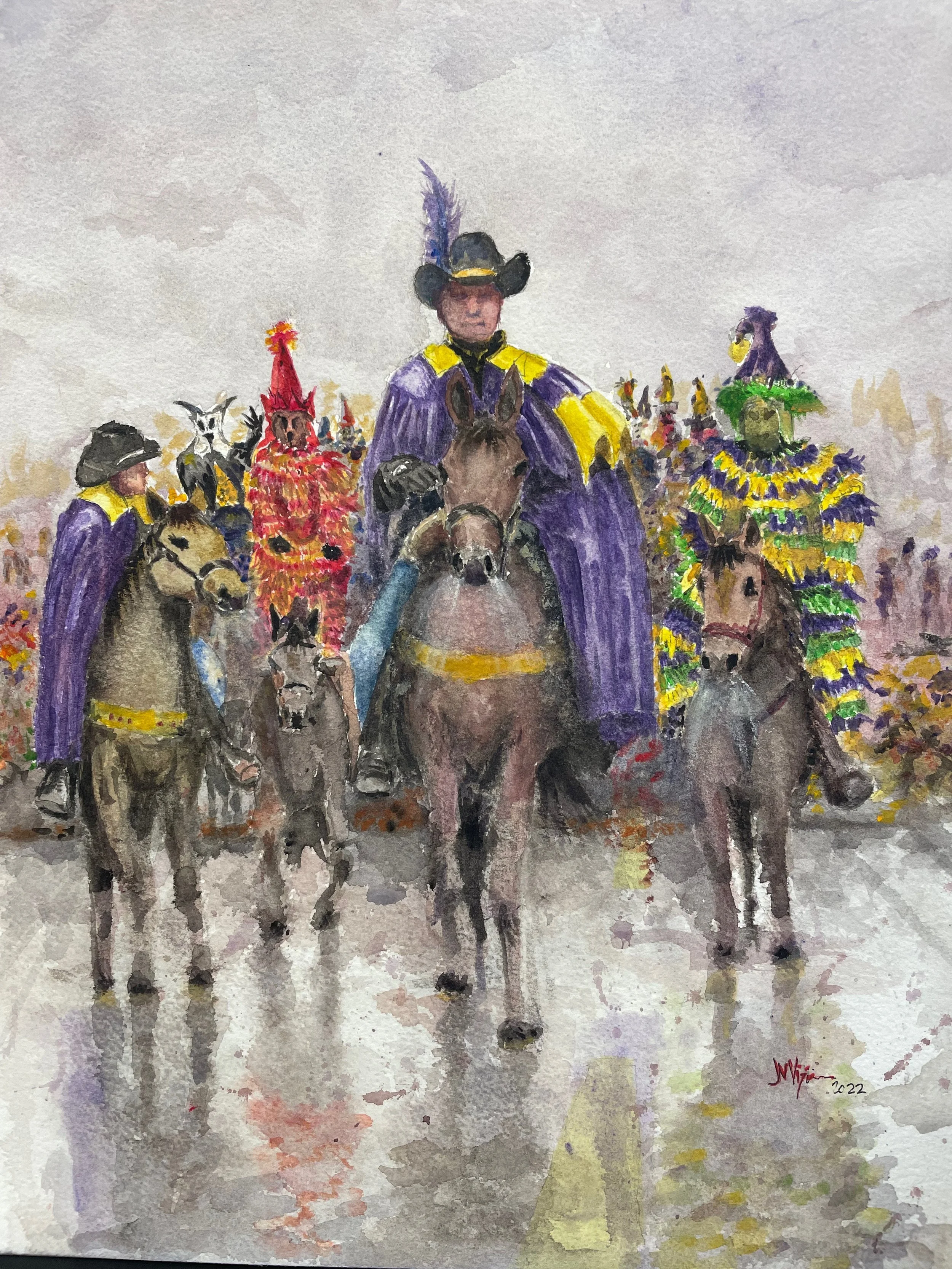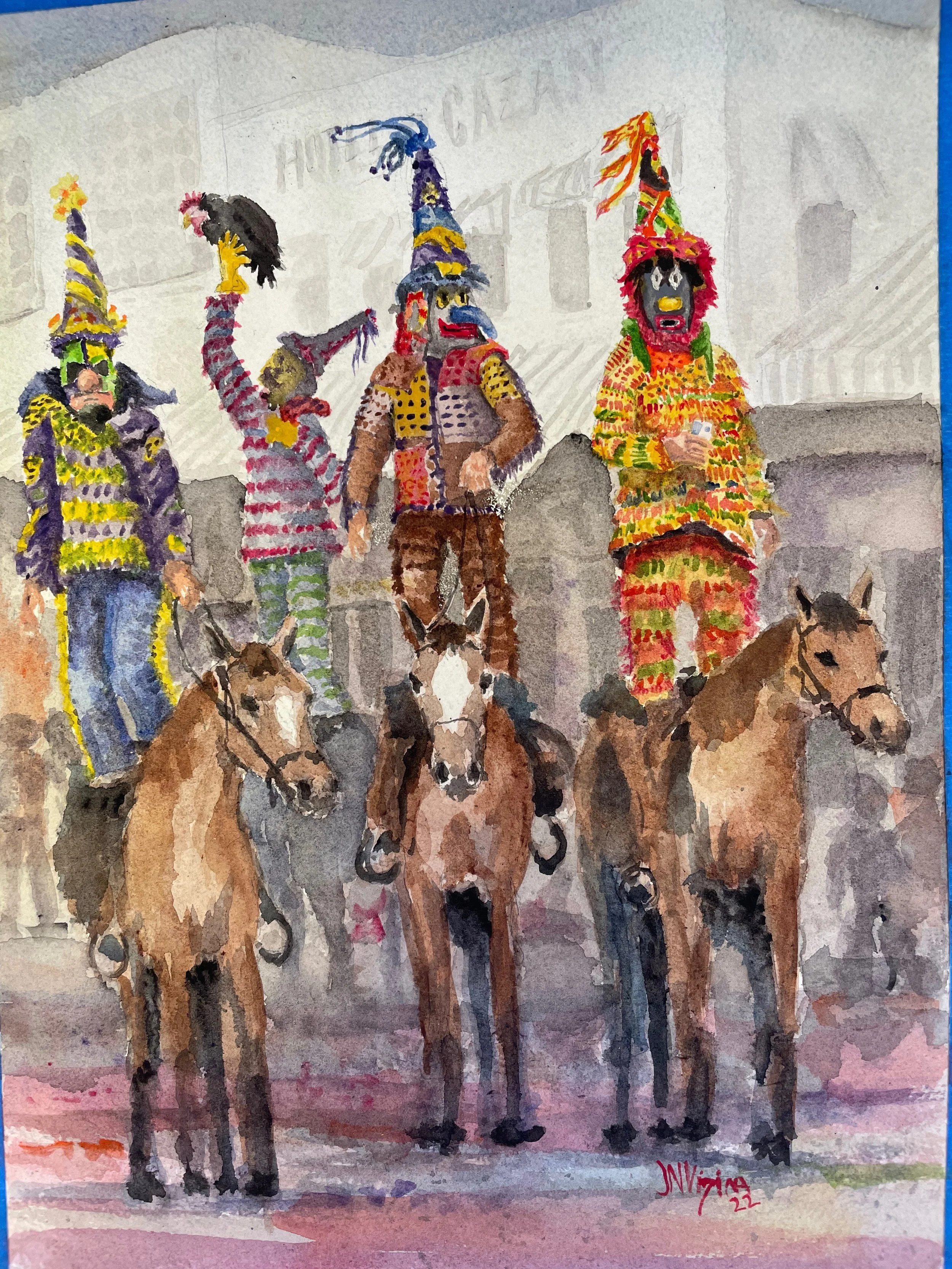 "March of the Capuchons- A Louisiana Tradition" 30X22 on Arches 300# Cold Press Cotton. The Last watercolor painting of the Courir de Mardi Gras Series. Original $1,700. Limited Edition signed prints are available 1-50; Prints (1) Original size 30X20; $200. (2) 12X16 $100. (3) 24X18 $150