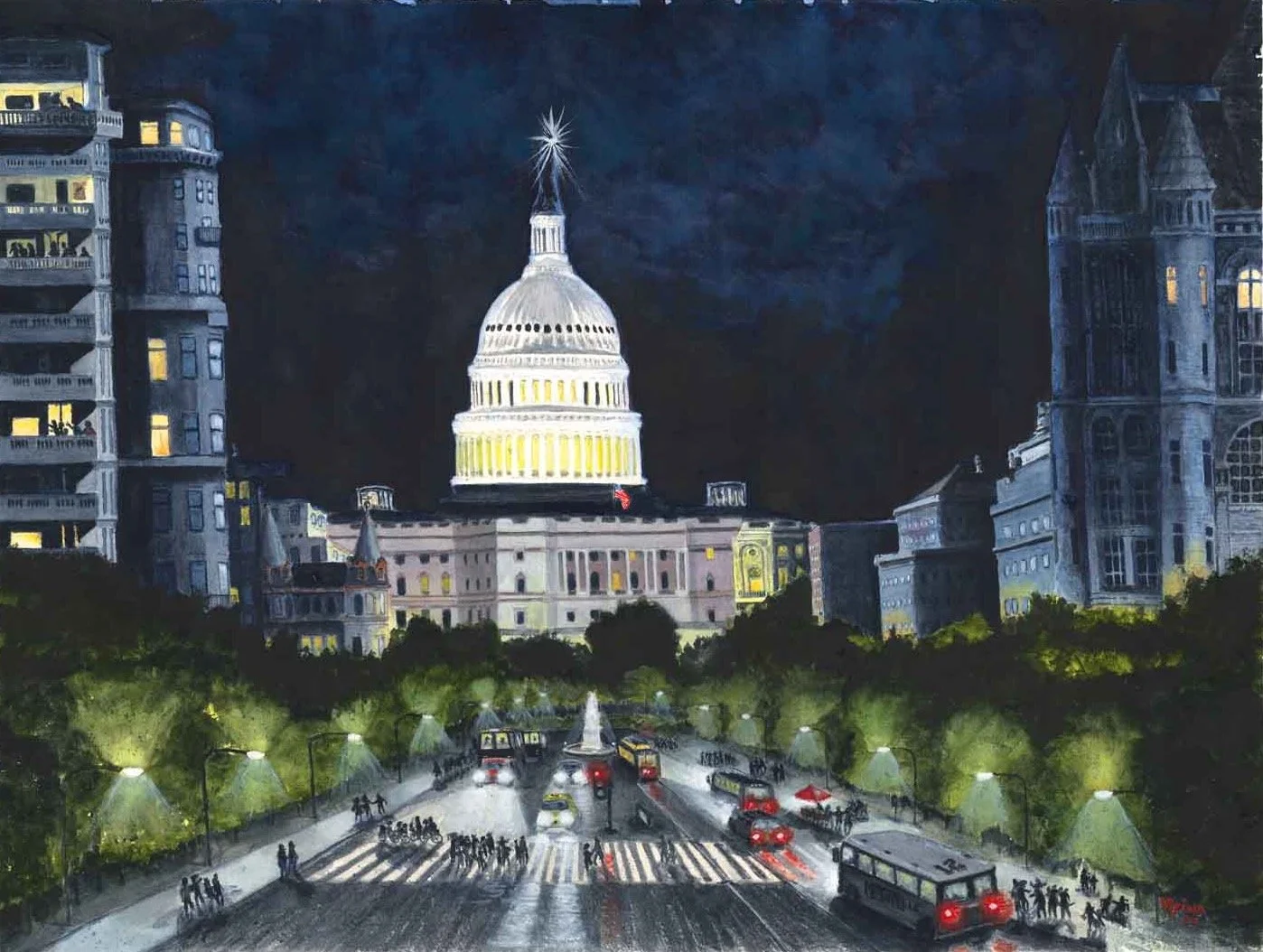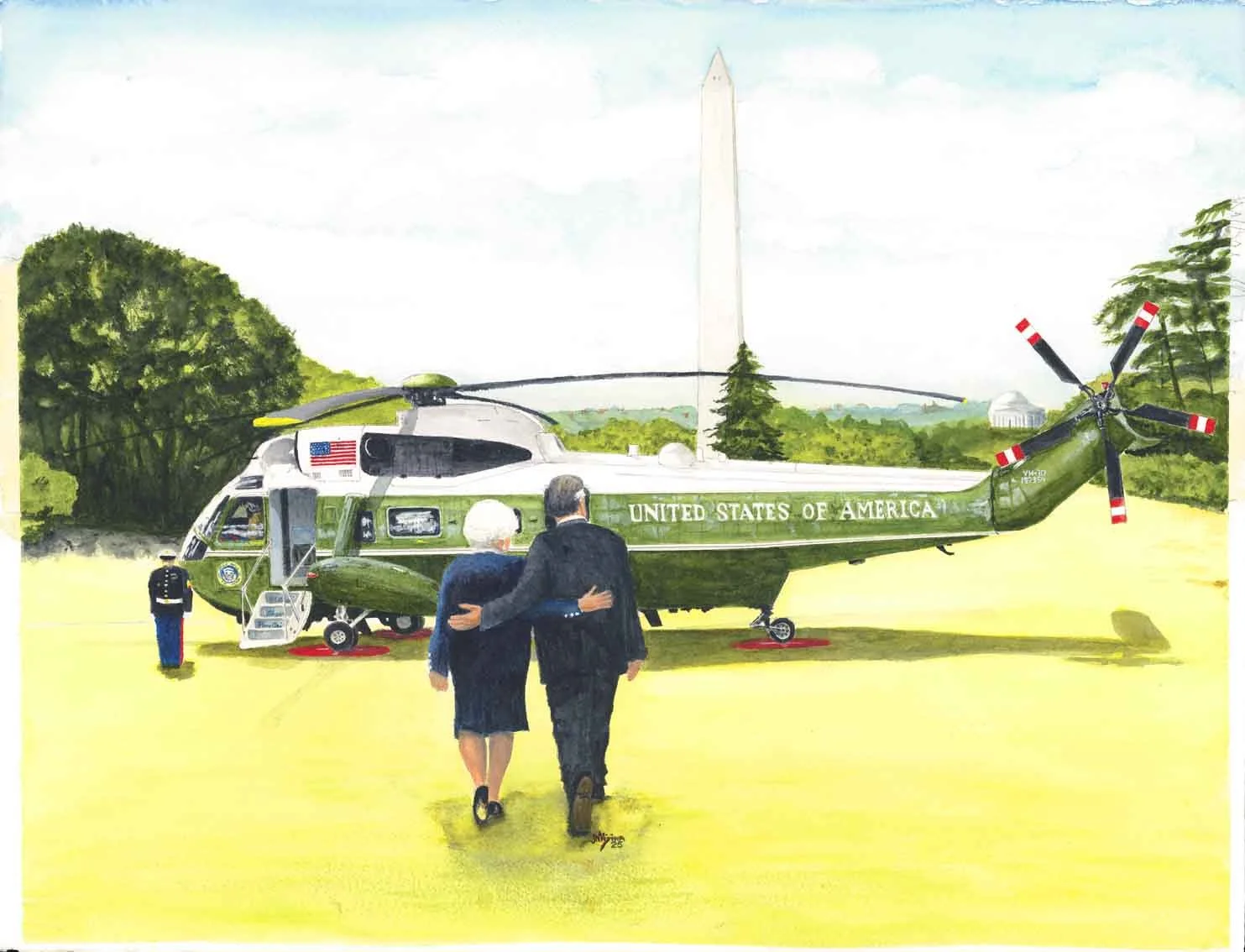 "Final Farewell" Depicts President George Bush and Barbra Bush departing the White House during 1992. Watercolor on 30"x22" on 400lb Arches cotton. The original is in the George Bush Library in College Station Texas. Limited prints available. Copy Right owned by the George Bush Library