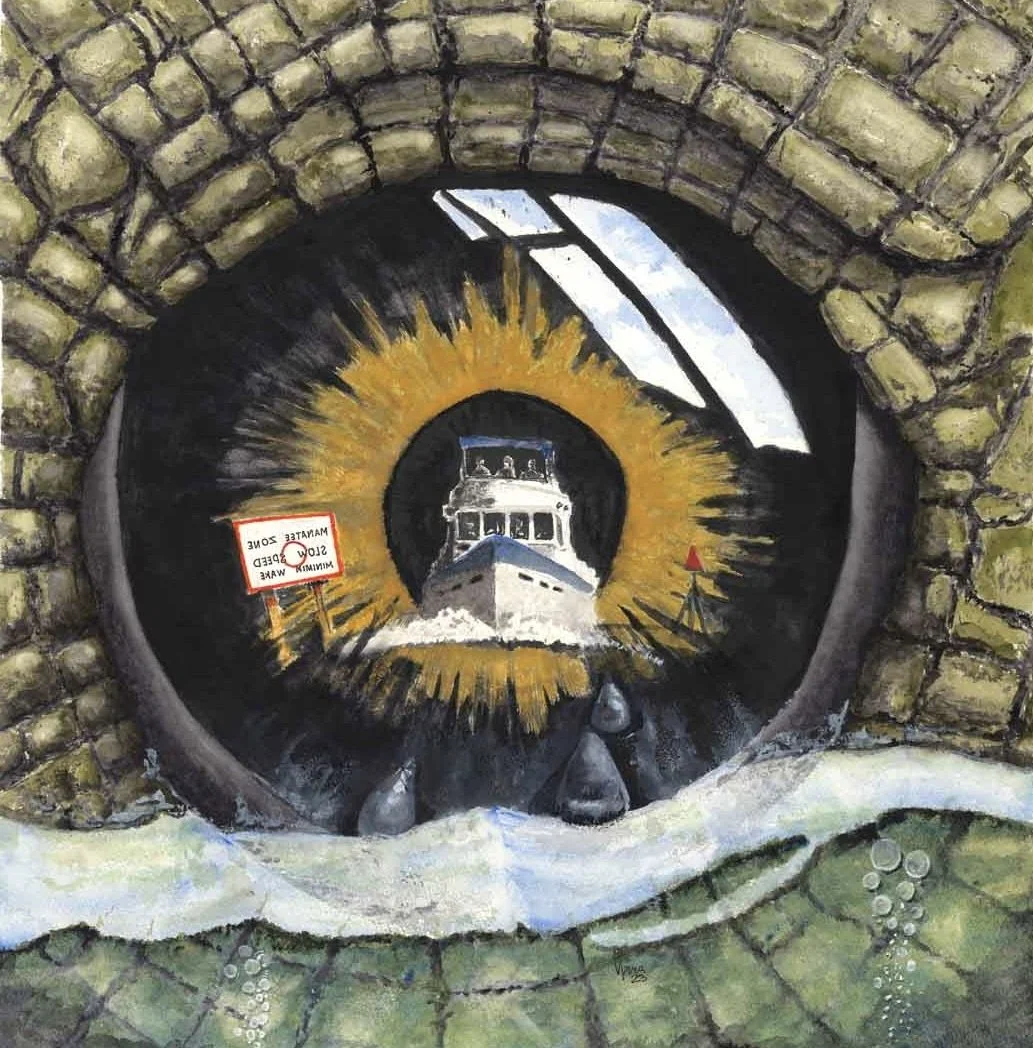 "A Manatee's Perspective", 20"x21" on Arches 300#, 100% cotton paper. Depicts the reflection of an approaching high speed vessel in a Manatee's eye. Original $550. Giclee Limited prints, 1 - 50, available. 21"X21" $150, 12"x16" $120
