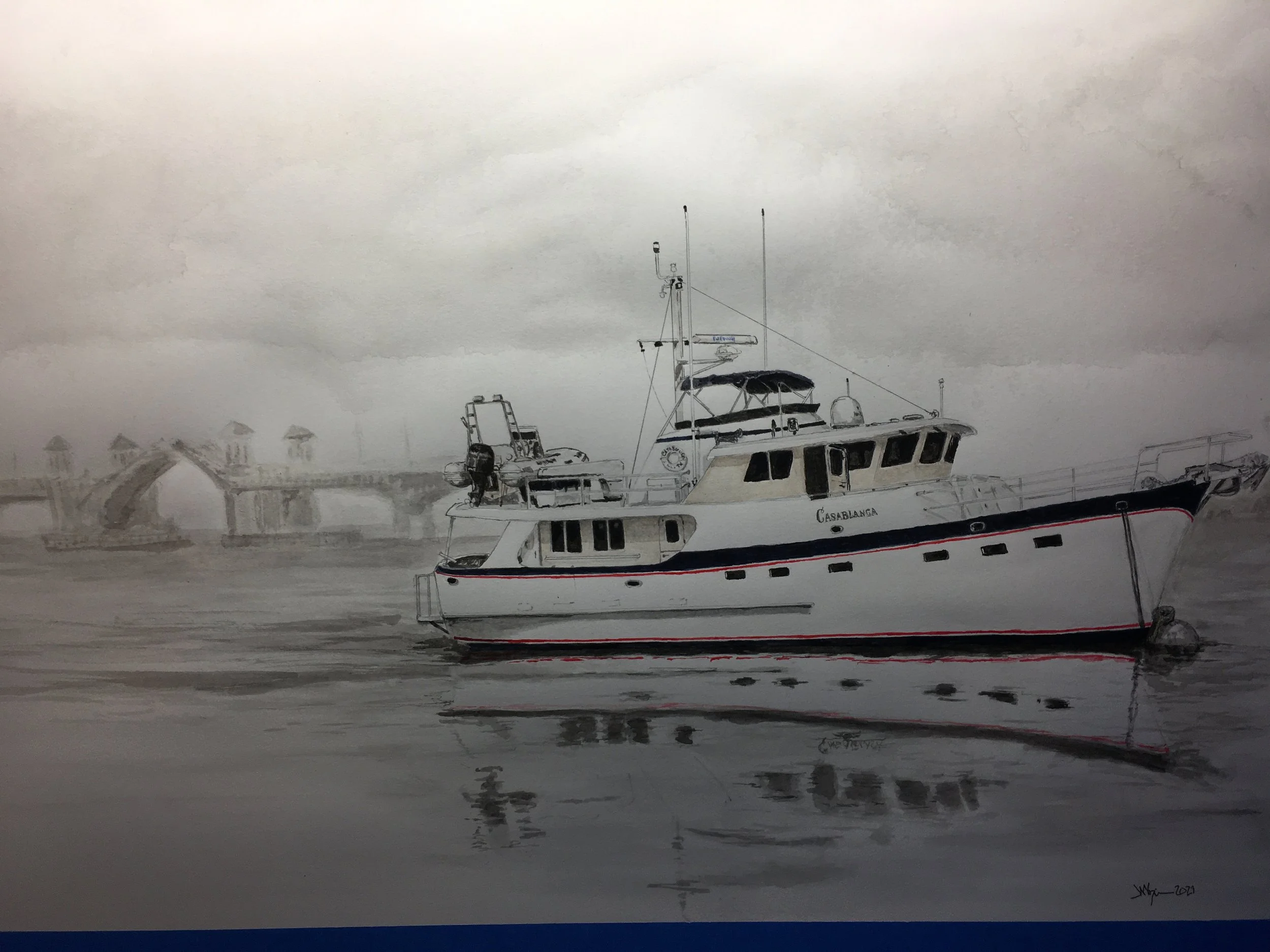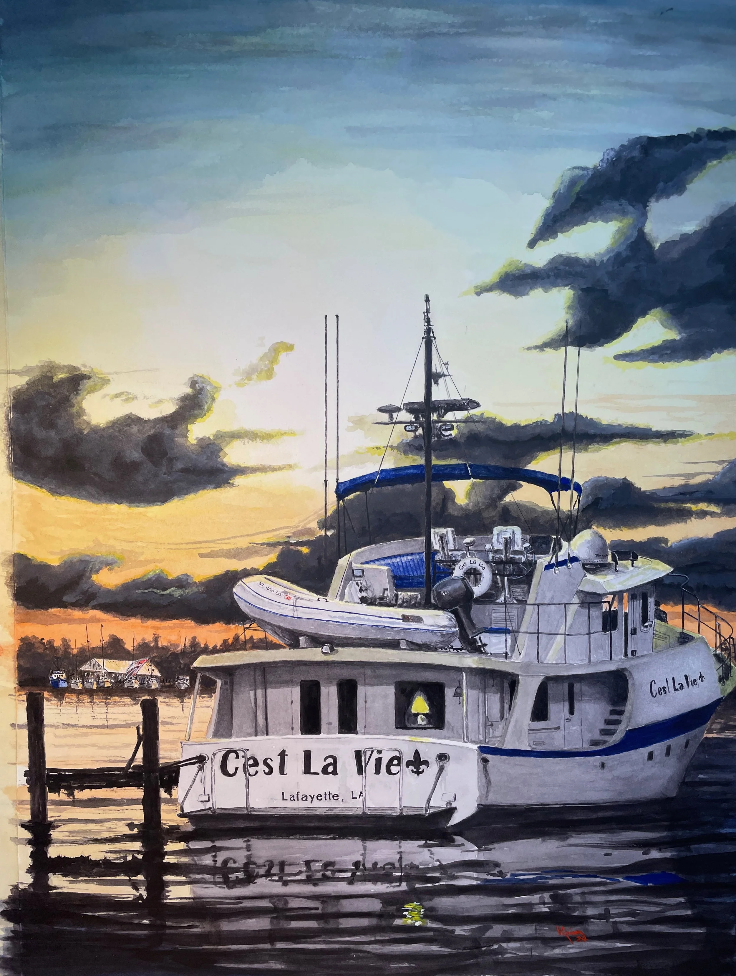 "C'est La Vie - Living the Dream", 22"x30" on Arches 300#, 100% cotton paper.. $2,500/Sold. Prints 1-50 available. A Kadey Krogen 58 model, hull no# 58011, our home for 4 1/2 years....Traveling up and down the east coast and the Bahamas.....This painting was awarded 1st Place at the Louisiana Watercolor Society's 2024 Fall Member exhibit in Lafayette Louisiana's Acadiana Center For The Arts.