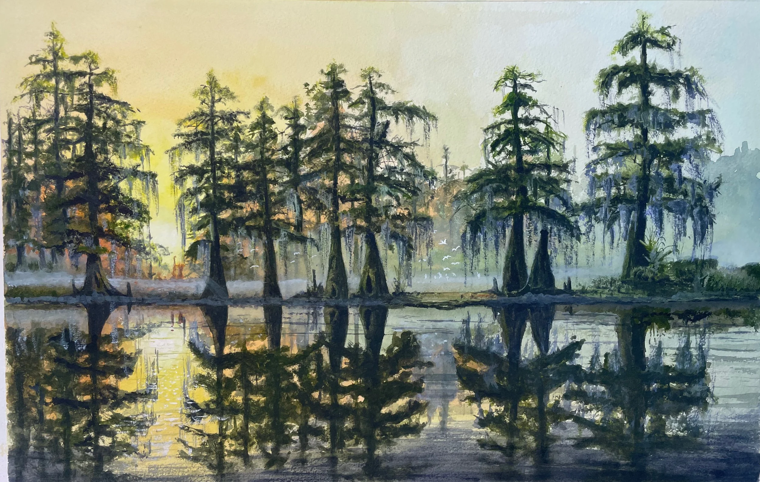 "Atchafalaya Morning", 22"x30" on Arches 300#, 100% cotton paper.. Original $1.500. Giclee Limited signed prints, 1 - 50, available. Original size 22"x30" =$225. 18"X24"= $150